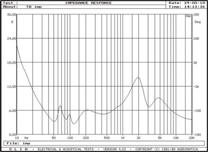 To, że firma T+A adresuje swoje produkty do ludzi inteligentnych i posiadających pewną wiedzę (nie "wiedzę", a wiedzę), świadczy jej przekonanie, że podanie prawdziwej, 4-omowej wartości impedancji znamionowej ich nie zniechęci. Nietypowa konstrukcja obudowy wpłynęła na charakterystykę impedancji w zakresie niskich częstotliwości - ale nie tylko ona, odezwało się tutaj również szczególne filtrowanie głośników niskotonowych. Dwa małe szczyty przy 65 Hz i 100 Hz pochodzą od samej obudowy, natomiast minimum przy 120 Hz najprawdopodobniej jest pogłębione wpływem nisko nastrojonego filtra dolnoprzepustowego sekcji niskotonowej. Z kolei od 50 Hz w dół skali charakterystyka szybko rośnie, to na pewno efekt działania filtra górnoprzepustowego, nastrojonego dość wysoko (jest taki również w Pencilu Adama, ale tam działa dopiero poniżej 20 Hz); na tej podstawie, nawet nie patrząc na charakterystykę przenoszenia, można się spodziewać, że bas TS300 nie będzie sięgał bardzo nisko.