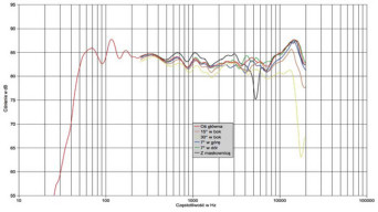 Spadek -6 dB względem średniego poziomu notujemy przy 43 Hz, na stromym zboczu - nie jest to bardzo nisko, producent obiecuje więcej - pasmo od 30 Hz do 45 000 Hz, ale nie podaje decybelowej tolerancji. W zakresie średnio-wysokotonowym charakterystyka jest generalnie dobrze zrównoważona, z niewielkimi różnicami między przebiegami dla różnych osi, tylko z lokalnymi nierównościami. Zwraca uwagę wzniesienie przy 15 kHz a także wpływ maskownicy - poza często spotykanym wąskopasmowym oddziaływaniem (tutaj przy ok. 5 kHz), widać podniesienie poziomu, o ok. 1 dB, w całym zakresie częstotliwości średnich - dzieje się tak na skutek znacznej grubości maskownicy, działającej trochę jak tuba (pomiar jej wpływu poza osią główną mógłby pokazać już spadek, a nie wzrost ciśnienia względem charakterystyki bez maskownicy). Efektywność to przyzwoite 85 dB, na poziomie innych kolumn tego testu.