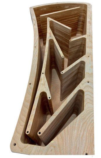 Można ją w łatwy sposób prześledzić ze zdjęcia – została sklejona z warstw ułożonych w pionie, od boku do boku, wcześniej opracowanych na maszynie CNC, czyli z wycięciami wewnątrz, składającymi się ostatecznie w kanały. Taka obudowa będzie też bardzo sztywna, jej front jest gruby i wykonany "w poprzek" warstw sklejki, a boki wzmacnia dodatkowo warstwa Corianu.