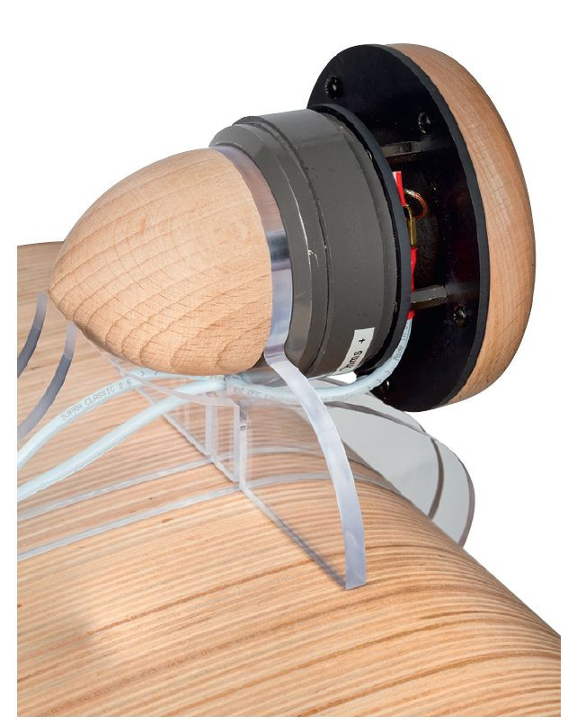 Głośnik wysokotonowy jest posadowiony na górnej ściance za pośrednictwem akrylowego, przezroczystego "statywu", o profilu dopasowanym do wygięcia górnej ścianki Vigo