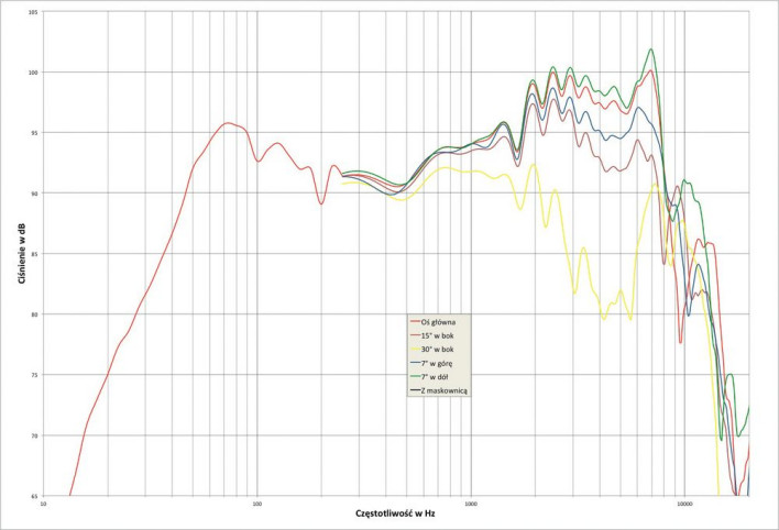 Wspomniane różnice nie są duże, również charakterystyki z osi +7° (de facto to większy kąt w stosunku do osi głównej przetwornika), a nawet z osi 15O (w poziomie) dochodzą na wysokim poziomie aż do około 7 kHz, a powyżej szybko opadają już na wszystkich osiach.