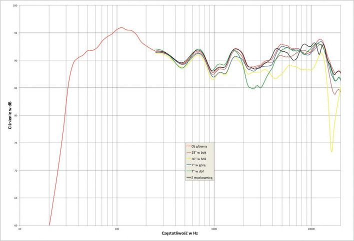 Charakterystykę przenoszenia można uznać za dobrze zrównoważoną; chociaż nie mieści się w ścieżce +/-3 dB w pasmie od 38 Hz do 21 kHz (co deklaruje producent), to niewiele jej do tego brakuje, a od 200 Hz do 16 kHz utrzymuje się w ścieżce +/-2 dB (na osi głównej).