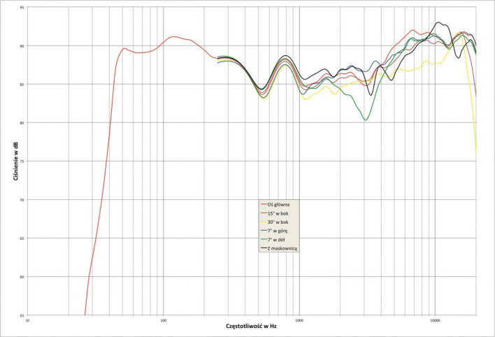 Pozytywna jest bliskość zmierzonych charakterystyk, tylko jedna z nich, z osi -7º, ma osłabienie przy 3 kHz, spowodowane utratą zgodności fazowej w okolicach drugiej częstotliwości podziału (między średniotonowym a wysokotonowym), natomiast współpraca niskotonowych i średniotonowego jest stabilna, mimo że częstotliwość podziału między nimi jest relatywnie wysoka (800 Hz).