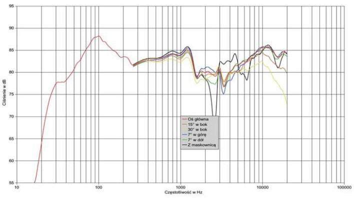 Konstruktor tej kolumny najwyraźniej nie pozostaje niewolnikiem schematycznego myślenia o neutralnym, liniowym przetwarzaniu... W okolicach 1,5 kHz charakterystyka przetwarzania gwałtownie opada o ok. 5 dB i pozostaje na niższym poziomie do ok. 4 kHz, powyżej powoli wznosi się, odzyskując przy 10 kHz poziom, jaki miała w okolicach 1 kHz. Zaburzenie przejścia między średnimi a wysokimi ma oczywiście związek z częstotliwością podziału, ale "wina" leży głównie po stronie sekcji średniotonowej, i to raczej nie jej filtrowania, lecz cech samego głośnika - schodek przy 1,5 kHz to z pewnością jego własna inicjatywa. Tym razem rzecz nie w relacjach fazowych między sekcjami, bo czuła na to zmiana osi w płaszczyźnie pionowej niewiele zmienia: przy +7O mamy co prawda ciut wyższy poziom przy 2 kHz, ale trochę niższy w zakresie 3-5 kHz; przy -7O odwrotnie. Z kolei założenie maskownicy wzmacnia 3-5 kHz, ale osłabia 5-7 kHz i wywołuje wąskopasmową zapadłość przy 2,5 kHz. Mimo wszystko na osi głównej niewiele brakuje do utrzymania się w polu +/-3dB, a osłabienie występuje w zakresie, w którym nasz słuch toleruje to dobrze.