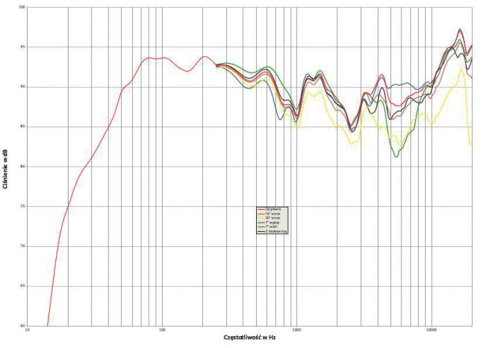 Wreszcie najgłębsze osłabienie przy 5–6 kHz występuje tylko na osi -7º; żeby go uniknąć, wystarczy nie siadać jednocześnie blisko i nisko. Najlepsze wypełnienie tego zakresu widzimy na osi +7º (gdy usiądziemy wysoko), ale i na osi głównej jest dobrze.