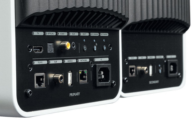 Każda jest aktywna (zawiera wzmacniacze), więc do każdej podłączamy zasilanie. Primary zawiera dodatkowe wejścia cyfrowe i analogowe, w Secondary mamy systemowe złącze komunikacyjne; w każdej jest wyjście subwooferowe.