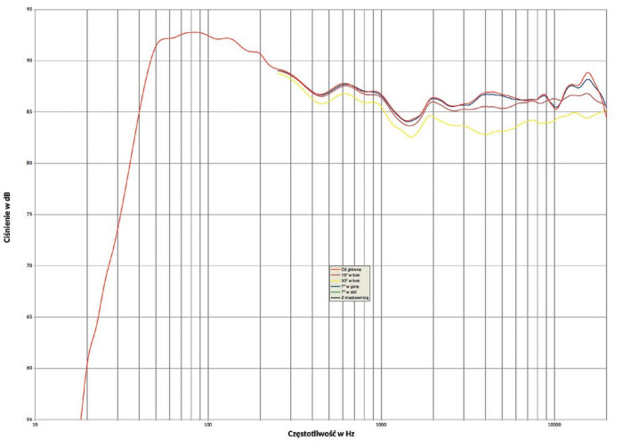 Charakterystyka w zakresie średnio- -wysokotonowym pokazana jest mniej liczną (niż zwykle) rodziną krzywych. Badanie na osiach +/-7O można sprowadzić do jednego pomiaru, bo układ jest symetryczny. Ponadto każdy uwzględniony w pomiarach kąt dotyczy praktycznie każdej płaszczyzny.