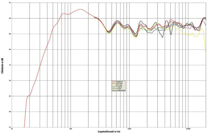 Charakterystyki zmierzone na osiach +/-7º leżą niedaleko charakterystyki z osi głównej – maksymalne różnice między nimi to 2 dB, a więc wyśmienicie. Swoją drogą, brak dość często spotykanego (i celowo wprowadzanego) osłabienia w zakresie kilku kHz może się wiązać z brzmieniem neutralnym i dobitnym, bez dodanej "uprzejmości".
