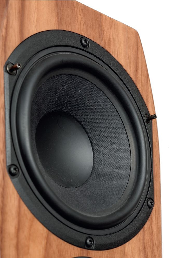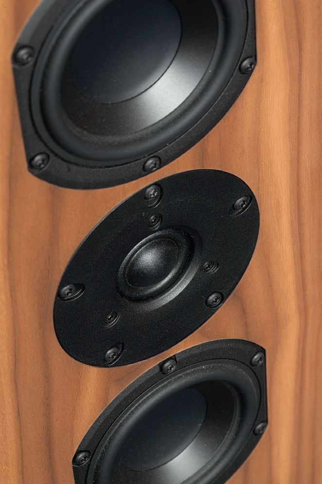 • Po pierwsze, małe głośniki średniotonowe pozwoliły zbliżyć centra akustyczne (mimo że wysokotonowy ma standardowy front, bez żadnych podcięć);