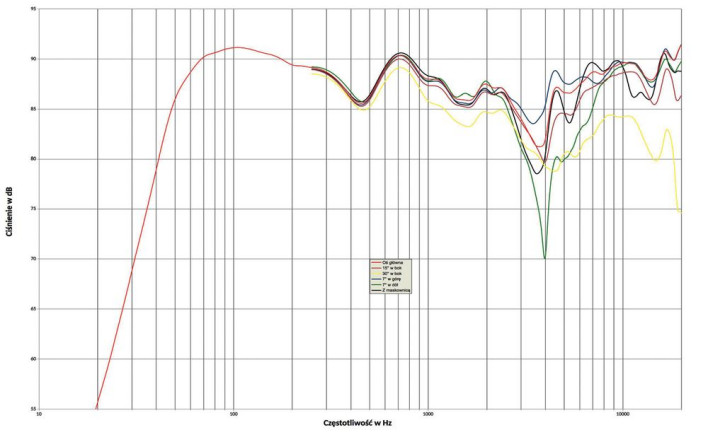 Największe osłabienie powstaje na osi -7º (gdybyśmy użyli wysokich podstawek i usiedli bardzo nisko). Zapadłość jest tak ostra i głęboka, że mówi to nam o niemal dokładnie przeciwnych fazach (na tej osi) promieniowania obydwu przetworników i jednocześnie wskazuje na częstotliwość przecięcia charakterystyk – 4 kHz.