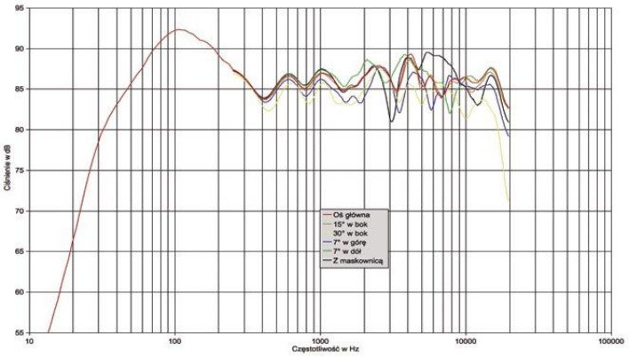Charakterystykę przetwarzania można dość łatwo opisać: w całym zakresie średnio- wysokotonowym, począwszy od 300 Hz, utrzymuje dość wyrównany poziom, bez wyraźnych tendencji, choć nie jest wygładzona, widać szereg lokalnych nierównomierności, z których wcale nie najmniejsze wprowadza maskownica. Z kolei różnice między osiami w płaszczyźnie pionowej nie są krytyczne, mimo że wyższy poziom w zakresie kilku kHz pojawia się na osi -7O; to wcale nie musi być korzystne, ponieważ wówczas zakres ten dominuje nad wysokimi tonami, proporcje mogą być lepsze na osi +7O (gdy będziemy siedzieć wyżej). W skali bezwzględnej rządzi bas, mający szczyt przy 100 Hz, lecz początkowo opadający dość łagodnie tak, że spadek -6 dB (względem poziomu średniego) odczytujemy przy 35 Hz.