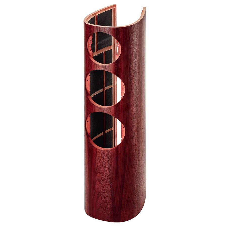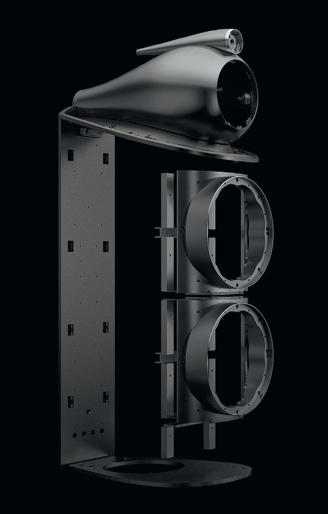 Korzystny efekt "opływania" fal występuje więc i tutaj, jednak sam producent podaje inny argument – mechaniczne wzmocnienie konstrukcji, poprzez odsunięcie miejsc łączenia różnych elementów obudowy aż do tyłu (gdzie krawędzie połączone są aluminiowym panelem, wyglądającym jak radiator), czyli daleko od źródeł naprężeń, jakimi są przetworniki niskotonowe.