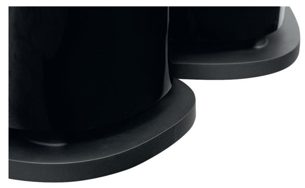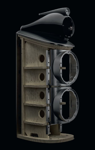 Głośniki niskotonowe pracują we wspólnej komorze bas-refleks, z dużym otworem (i oczywiście tunelem) wychodzącym przez dolną ściankę. Dalej ciśnienie może rozchodzić się dostatecznie swobodnie dzięki 3-cm szczelinie między obudową a cokołem.