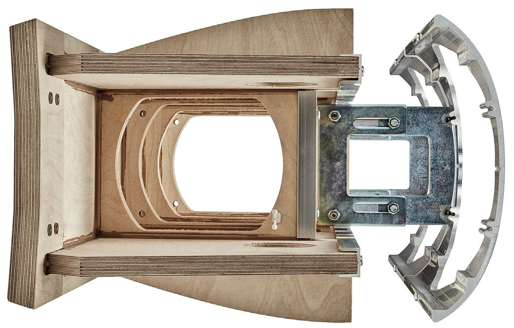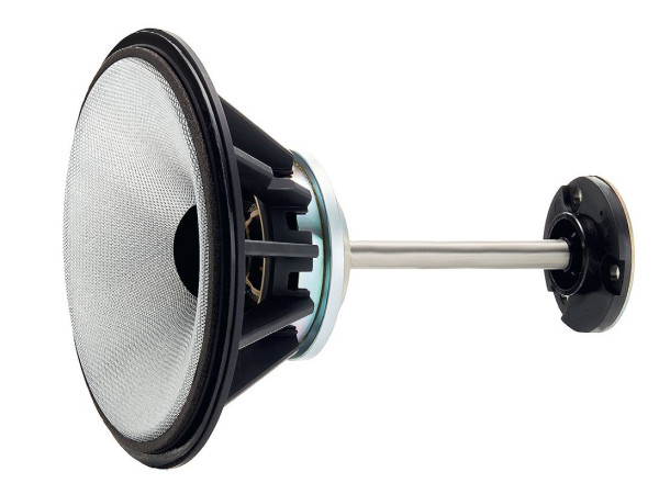 Kiedyś ta fajka była już tak długa, a potem ją skrócono... Teraz ma jednak jeszcze inny kształt i jest wyfrezowana z jednego kawałka aluminium. Tutaj również udoskonalono elastyczne mocowanie (niezależne od mocowania głowy średniotonowej). A na samym dole... przerobiono cokół będący wcześniej odlewem ze stopu aluminium i cynku, a teraz jest odlewem aluminiowym z warstwą tłumiącą trzymaną od spodu przez stalową płytę.