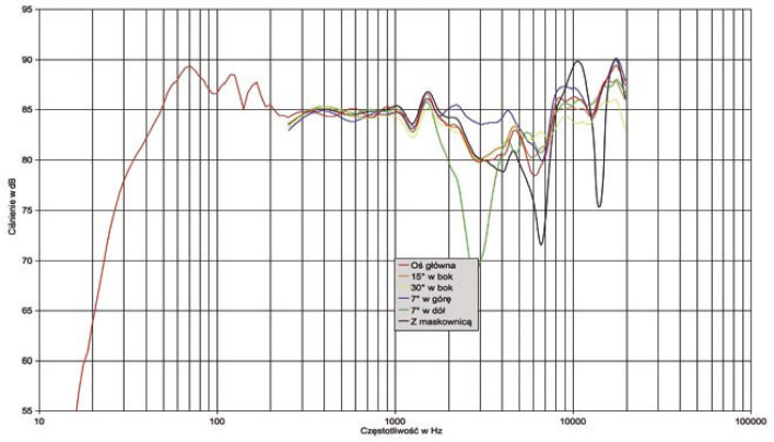 Co prawda w zakresie wysokich tonów, przy 5 kHz wartość impedancji spada do 5 omów, ale tam nie wywołuje to wzmożonego wysiłku wzmacniacza, najważniejsze że w zakresie nisko- średniotonowym utrzymujemy się powyżej pułapu 6 omów. Przy dobrym ogólnym zrównoważeniu charakterystyki przetwarzania nie sposób też nie zauważyć jej głębokich zapadłości w zakresie średnio-wysokotonowym, ale wszystkich można uniknąć przy odpowiednim ustawieniu. To również powód, dla którego warto przygotowywać i czytać laboratoria w Audio. Pierwsze osłabienie, przy 3 kHz, pojawia się na osi -7° (w dół) i jest prawdopodobnie efektem nieskorelowania fazy między sekcją średniotonową a wysokotonową; najlepiej więc usiąść wysoko, z głową na poziomie 1 metra, a charakterystyka przejdzie przez ten zakres płynnie. Dwie kolejne wąskopasmowe zapadłości, przy ok. 7 kHz i 14 kHz, są efektem odbić od maskownicy - trzeba ją zdjąć i po sprawie. Bas z zakresem średnich częstotliwości łączy się bez kłopotów, jakich zwykle doświadczamy przy układzie z niskotonowym na bocznej ściance
