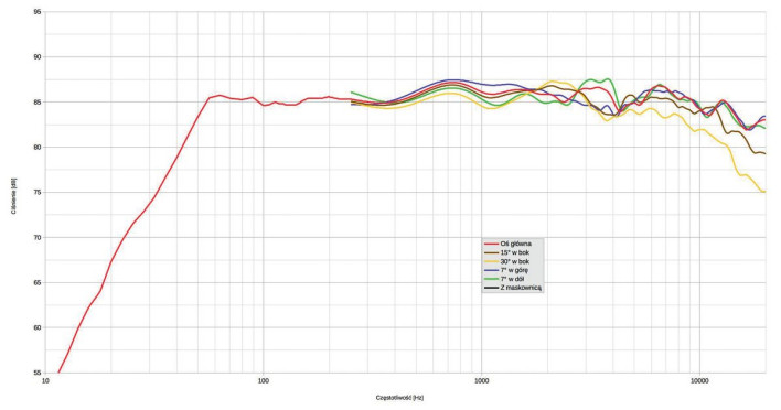 Przy 24 Hz notujemy jednak spadek aż ok. 12 dB względem poziomu średniego, a przy 50 kHz... nasz pomiar kończy się przy 20 kHz, jednak wcześniejszy spadek nie wzmacnia nadziei na taką rewelację, chociaż charakterystyki sztywnych kopułek często "opadają", zanim wyskoczą z rezonansem break-up, a ten w przypadku berylu może leżeć wysoko.