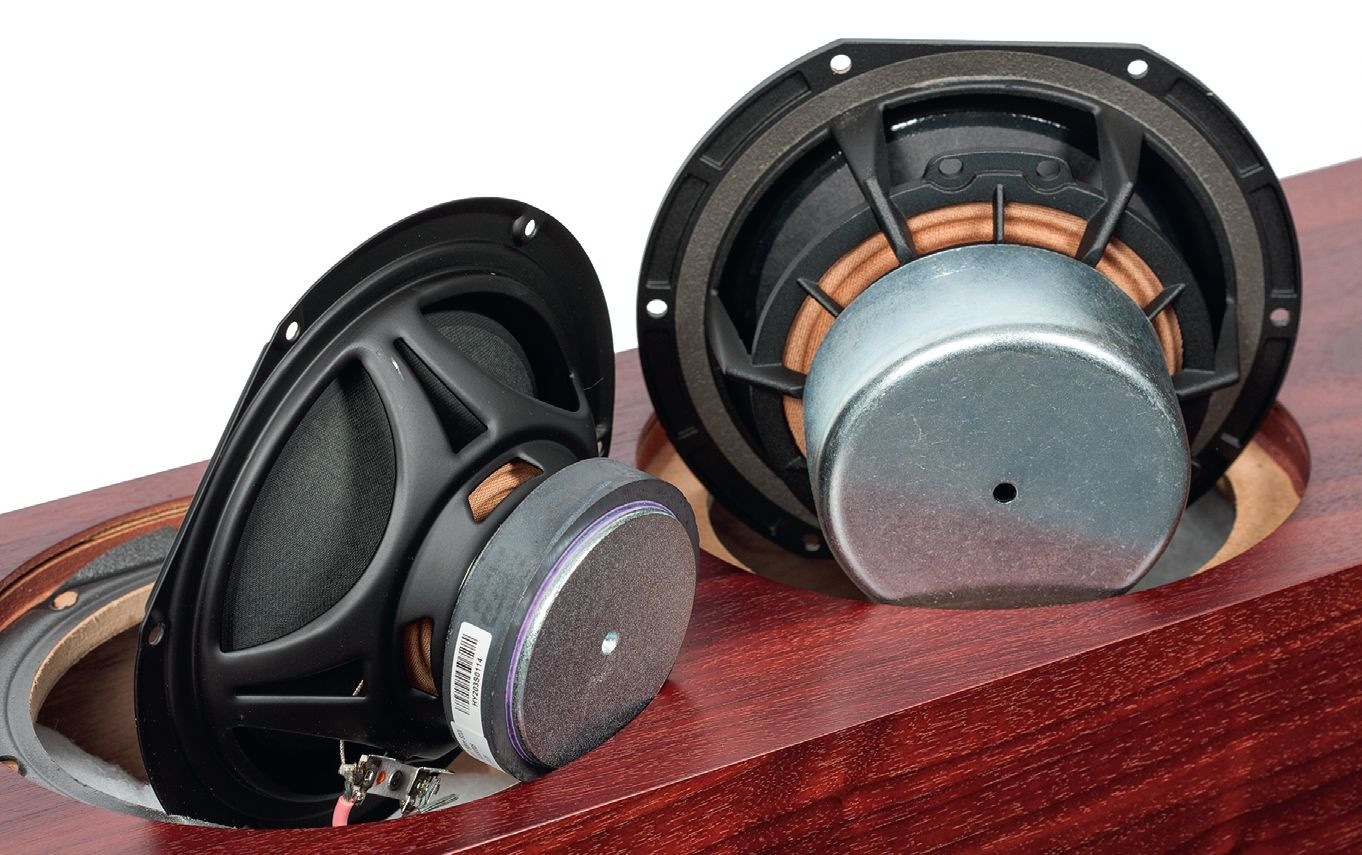 Głośniki nisko-średniotonowy (z lewej) i niskotonowy mają taką samą średnicę (całkowita 18 cm, 16,5 cm między "ścięciami" koszy), ale poza tym różni je wszystko. Pierwszy ma blaszany kosz i 8-cm układ magnetyczny, drugi kosz odlewany i mocniejszy „napęd”, odpowiedni do pracy w bas-refleksie.
