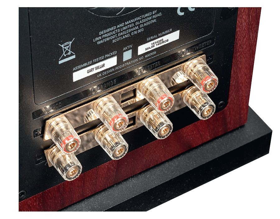 Cztery pary zacisków pozwalają na niezależne podłączenie każdej sekcji. Szykowanie czterech par kabli albo i czterech wzmacniaczy to niezbyt rozsądne w wersji pasywnej, ale dzięki takiemu przygotowaniu możemy uruchomić system aktywny ze wzmacniaczami (i aktywną zwrotnicą) na zewnątrz, do czego Linn bardzo nas zachęca.