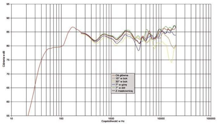 Laboratorium Osłabienie okolic 100 Hz, ale poniżej bas dociąga z dobrym poziomem do 50 Hz, zakres średnio-wysokotonowy dobrze wyrównany. Efektywność 84 dB, bardzo łatwa impedancja 8 omów.