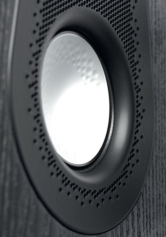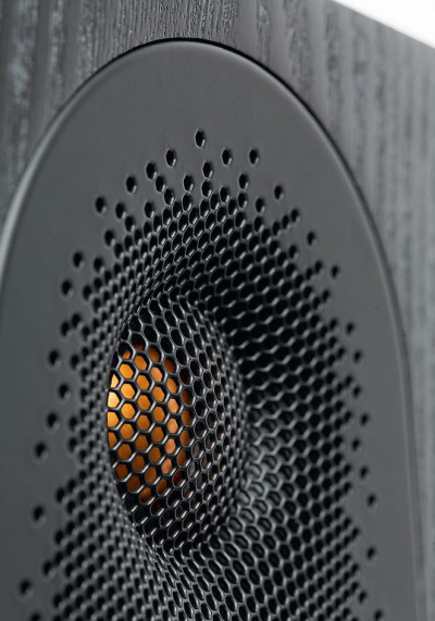 Kopułka wysokotonowa 25-mm również jest wykonana z C-CAM, ale już bez wgnieceń, za to z "pozłoceniem". Wokół kopułki utworzono krótki falowód zasłonięty wraz z nią wyprofilowanym w tym miejscu, fantazyjnie perforowanym panelem, jednocześnie integrującym wysokotonowy ze średniotonowym. Odległość między centrami akustycznymi tych przetworników wynosi tylko 8 cm (dwa razy mniej niż przy typowej konfiguracji z przetwornikiem 18-cm).