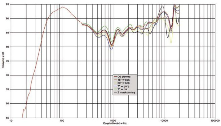 Bas szarżuje w okolicach 100 Hz, mając spadek -6 dB (względem poziomu średniego) przy 40 Hz, w najwyższej oktawie (10-20 kHz) widać nierównomierności (zwłaszcza z maskownicą), ale większa część charakterystyki, od 300 Hz do 7 kHz, jest prowadzona stabilnie i to na wszystkich osiach, nie licząc wąskiego osłabienia w okolicach 1 kHz.