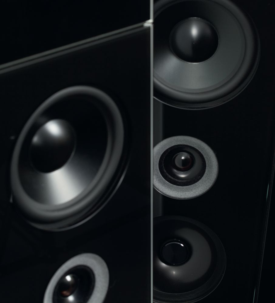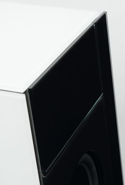 Panele wokół głośników są zawsze szklane (czarne), pozostałe mogą być szklane (na zdjęciu białe) lub drewniane.