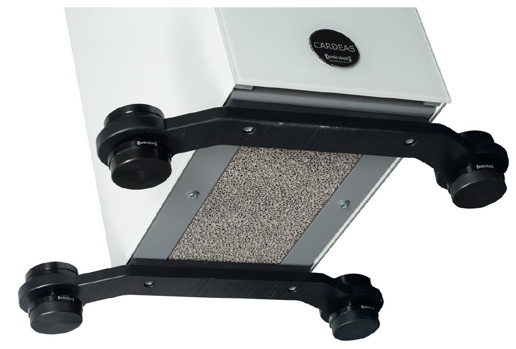 Kolumna stoi na typowych dla Audio Physica podporach – grubych aluminiowych sztabach. Rozstawiają one punkty podparcia bardzo szeroko, trzeba to wziąć pod uwagę przy planowaniu miejsca dla Cardeasów, ale dzięki nim kolumny stoją całkowicie stabilnie i bezpiecznie.