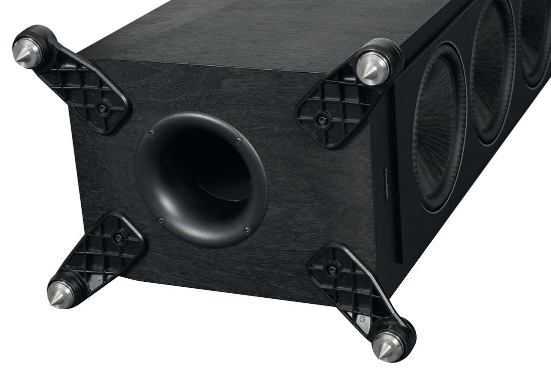 Bas-refleks ukrywa się na dolnej ściance, ale wcale nie przeszkodzi mu to działać bardzo efektywnie, a nawet pomoże – sąsiedztwo podłogi zwiększy ciśnienie. Duża powierzchnia otworu jest potrzebna dla obsługi trzech 20-tek o bardzo dużym wychyleniu, a długi tunel stroi obudowę do ok. 20 Hz.