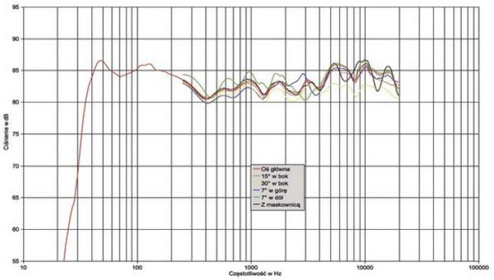 Przy przechodzeniu z zakresu częstotliwości niskich do średnich poziom nieco się obniża, ale warto zwrócić uwagę, że na osi -7O jest trochę wyższy - prawdopodobnie dlatego, że lepsza jest tam korelacja fazowa między niskotonowym a nisko-średniotonowym (bo odległość od nich do mikrofonu staje się podobna), więc lepszą (wyższą w tym zakresie) charakterystykę na osi głównej mielibyśmy, gdyby niskotonowy znajdował się bezpośrednio pod nisko-średniotonowym, tak jak w większości układów dwuipółdrożnych. Dalej charakterystyka jest dobrze wyrównana, przejście przez drugą częstotliwość podziału płynne, a same wysokie tony, podane z nieco wyższym poziomem niż średnie, wyglądają lepiej niż kiedykolwiek z Uni-Q (bez ostrych szarpnięć w najwyższej oktawie).