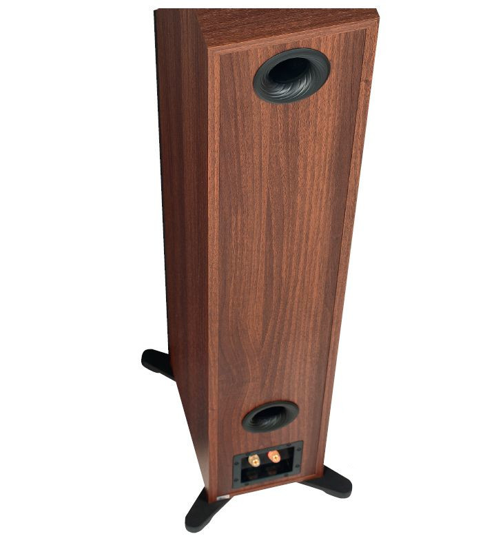 Wspominamy o tym często (a w tym teście za każdym razem…), jednak producenci realizują to rzadko, stosując z różnych przyczyn wspólną komorę. Tym razem jednak aż się prosi – obudowa jest wyjątkowo wysoka, ustawienie głośników nie utrudnia zadania (uwzględniając małą komorę dla średniotonowego, należałoby wstawić pomiędzy głośniki przegrodę opadającą ku tyłowi, aby stworzyć dwie jednakowe), wreszcie że tak właśnie uczyniono, podpowiadają dwa otwory bas-refleks umieszczone w dużej odległości od siebie. Podpowiedź ta okazuje się jednak zwodnicza, bowiem komora znowu jest jedna…