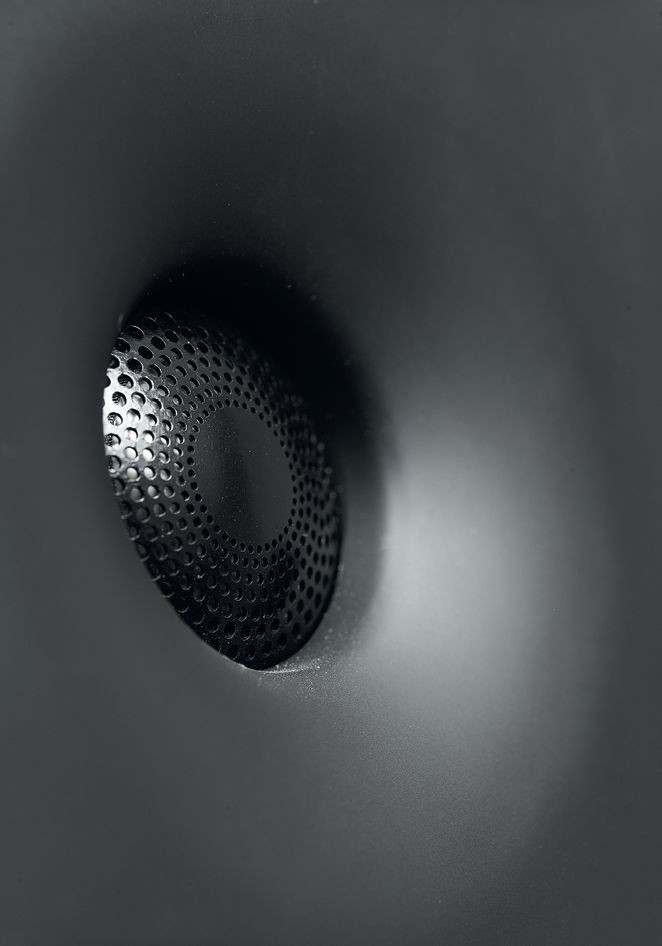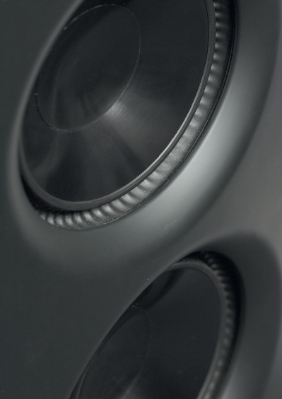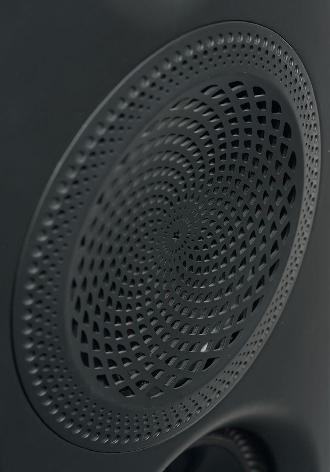 Głośnik średniotonowy jest zasłonięty perforowanym talerzem, mającym pełnić rolę soczewki akustycznej, nazwanej przez producenta PPA ("Perforated Phase-Aligning").