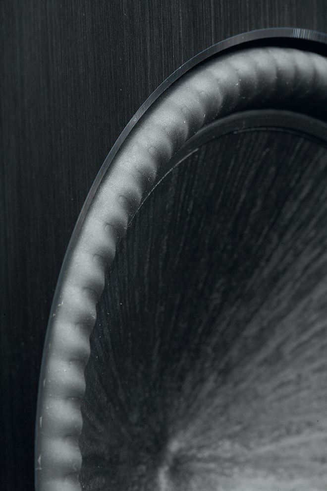 Tym razem udało się nam wykręcić głośniki, wyjąć je, obejrzeć ze wszystkich stron… Chociaż z zewnątrz nie widać żadnych mocowań, Foundery są zaprojektowane nowocześnie i elegancko, kosze i śruby są zasłonięte przez aluminiowy panel, który jednak da się dość łatwo zdjąć – trzymany jest siłą magnesów, podobnie jak maskownica; wystarczy chwycić go przy dolnej krawędzi, co ułatwia przygotowany tam uskok.