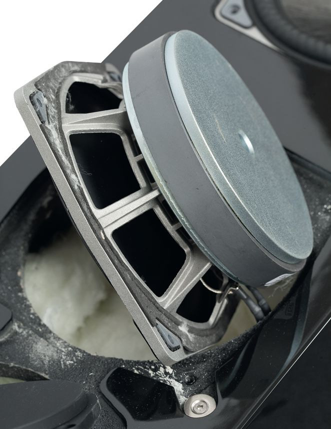 Głośnik średniotonowy ma oczywiście własną komorę zamkniętą, ale 90% objętości obudowy zajmuje wspólna komora trzech niskotonowych pracująca w systemie bas-refleks. Tunel jest wyprowadzony przez dolną ściankę, ciśnienie wydostaje się na zewnątrz dzięki odpowiednio wysokim nóżkom i kolcom (tym razem bez pośrednictwa cokołu).
