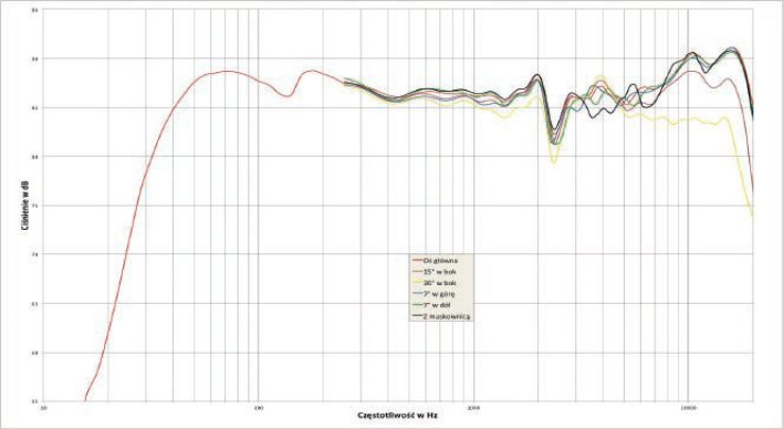 Również dzięki niskiej impedancji, charakterystyka C5 wspięła się na wysoki poziom ok. 87 dB (2,83 V, 1 m). Tutaj już żadnych poważnych zarzutów mieć nie można - gdyby zignorować lokalne zawahanie przy ok. 2 kHz, to charakterystyka z osi głównej mieści się w ścieżce +/-3 dB, a z osi 15O nawet +/-2 dB; zmiany wysokości (+/-7O) nie robią dużej różnicy (względem osi głównej), podobnie maskownica, którą można zostawić założoną bez żadnej szkody dla brzmienia.
