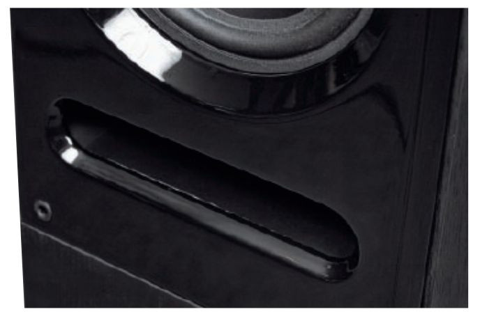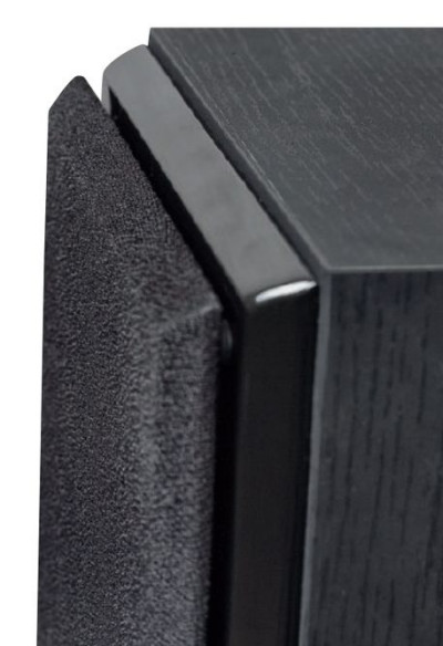 W związku z wciąż panującą modą na błyszczącą czerń zdecydowano się ją umieścić na górnej części frontu (zajętej przez głośniki, które możemy też zasłonić maskownicą). Sama skrzynka oklejona jest folią drewnopodobną (w teście czarną, dostępna jest też czereśniowa).