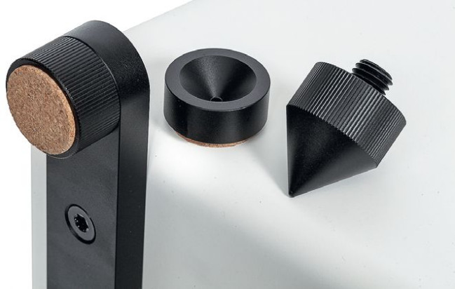 Masa i wrażenia dotykowe są takie, jakby obudowa została wykonana z jakiegoś kompozytu. Od producenta dowiadujemy się o zastosowaniu HDF-u. Na dole dodano grube metalowe sztaby wystające po bokach, stabilizujące kolumnę i wyglądające lepiej niż klasyczne cokoły.