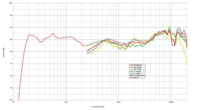 Druga rewelacja to bardzo dobre rozpraszanie w zakresie średnio-wysokotonowym, praktycznie aż do samej granicy mierzonego przez nas zakresu (20 kHz). Dopiero pod największym kątem 30º(w płaszczyźnie poziomej) i powyżej ok. 10 kHz charakterystyka opada wyraźnie szybciej od pozostałych, które trzymają się bardzo blisko siebie.