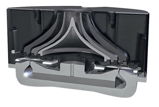 Powierzchnia membrany jest specyficznie pofalowana w celu rozproszenia rezonansów, a przed nią uformowano zespół okrągłych szczelin prowadzących do ich wspólnego wylotu o średnicy 5 cm, będącego z kolei wlotem (początkiem) zewnętrznej tuby, dołożonej już przez Klipscha, wraz z soczewką akustyczną w formie zespołu pierścieni.