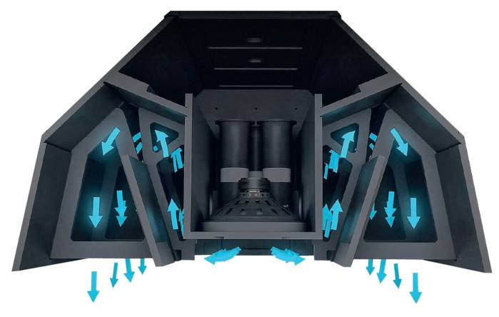 Gdzie są otwory? Też w całości ukryte wewnątrz konstrukcji, bowiem trzy tunele o średnicy ok. 10 cm i długości ok. 40 cm, sięgając w głąb komory bas-refleks, zostały zainstalowane w tej samej przegrodzie co głośniki. Ich promieniowanie, razem z promieniowaniem przedniej strony głośników, biegnie więc przez tubę, która jest symetrycznie rozdzielona na dwie sekcje – lewą i prawą.