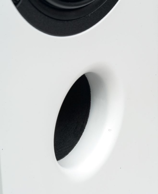 Wymyślono nawet oryginalny układ mocowania koszy; zamiast przykrywać go pierścieniem, co dzisiaj ma w zwyczaju robić wielu producentów, wkręty pozostawiono na wierzchu, ale skonfigurowano je nietypowo, jakby pomijając dwa z sześciu, które znajdowałyby się na osi symetrii. Z przodu znajduje się też wylot bas-refleksu, ładnie wyprofilowany w samym panelu frontowym.