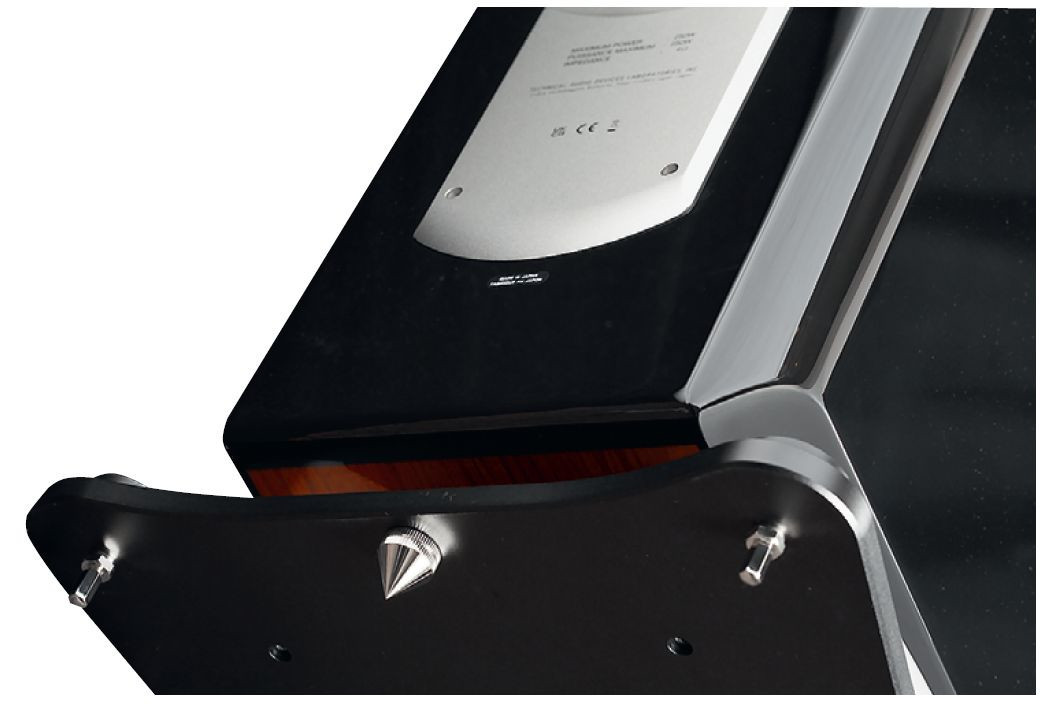 W tym przypadku podstawa prezentuje się wybornie, tylko dodaje urody, ale nie jest to czcza dekoracja. Została wykonana z solidnych metalowych elementów, składa się dolnego czarnego blatu o grubości 15 mm, połączonego ze "skrzynią" parą potężnych płóz. Tak jak w wielu współczesnych kolumnach, tworzą one prześwit, przez który uchodzi promieniowanie systemu bas-refleks – do przodu i do tyłu.
