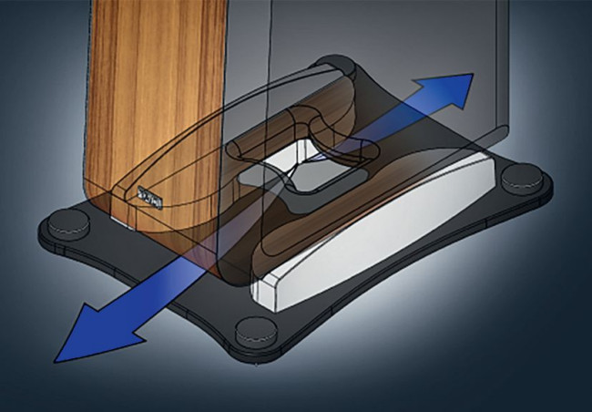 Boczne płozy unoszą właściwą obudowę, tworząc wyprofilowane ujście dla promieniowania bas-refleksu – do przodu i do tyłu.