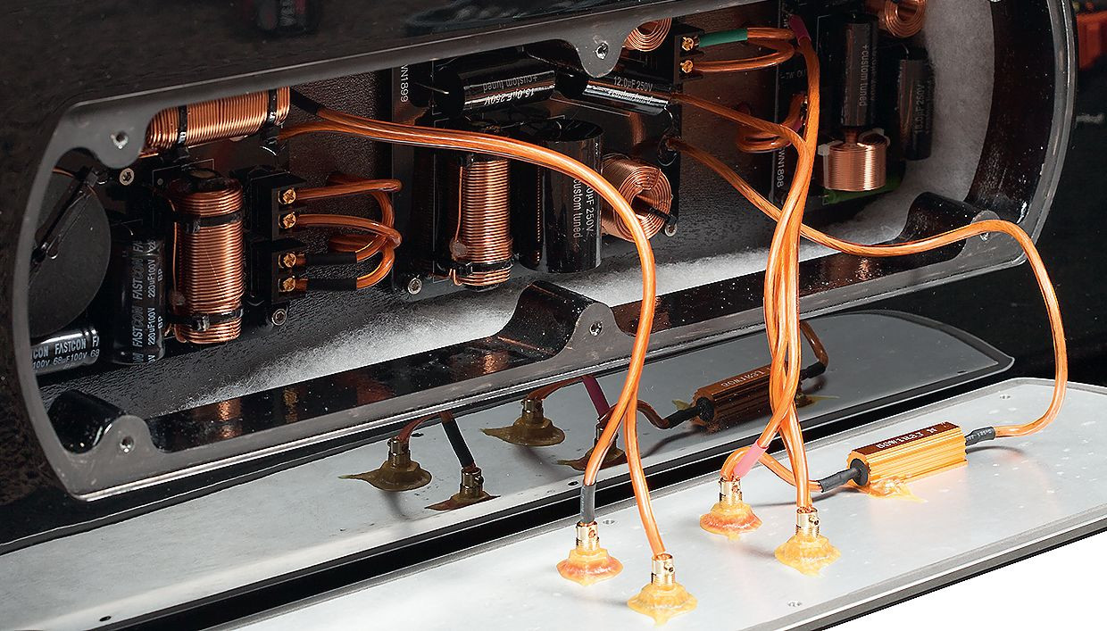 Zwrotnica jest odizolowana od wszelkich zakłóceń – od wibracji obudowy, ciśnienia pochodzącego z głośników, od wzajemnego wpływu jej elementów. Jest rzeczywiście bardzo rozbudowana, wszystkie filtry są 4. rzędu, w przypadku obydwu dolnoprzepustowych (dla sekcji niskotonowej i średniotonowej) i górnoprzepustowej dla wysokotonowego – filtry elektryczne są 4. rzędu (po dwie cewki i po dwa kondensatory), w przypadku górnoprzepustowego dla średniotonowego filtr elektryczny jest najprawdopodobniej 2. rzędu, ale wraz z "naturalnym" zboczem głośnika, pojawiającym się poniżej częstotliwości podziału, powstaje zbocze zmierzające do asymptoty 4. rzędu.