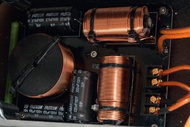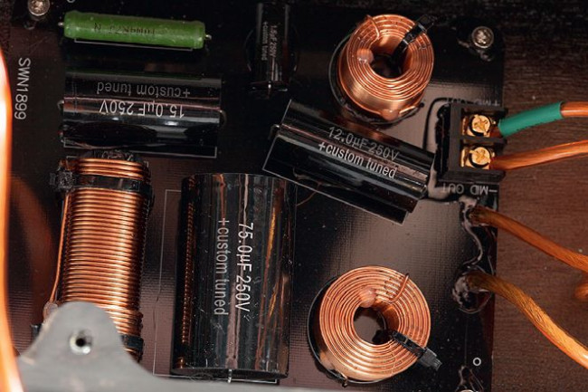 Filtr średniotonowego – dwie mniejsze cewki (powietrzne) i dwa kondensatory tworzą fi ltr dolnoprzepustowy 4. rzędu, a największy kondensator i cewka rdzeniowa – filtr górnoprzepustowy 2. rzędu (do którego zbocza dodaje się "naturalne" zbocze głośnika o wysokiej częstotliwości rezonansowej).