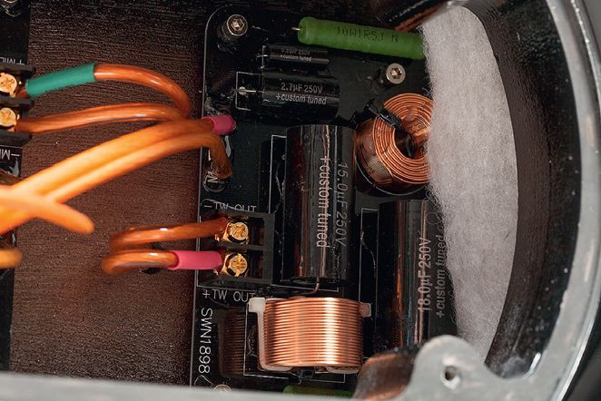 Sekcja niskotonowa zawiera trzy duże cewki i trzy kondensatory. Prawdopodobnie dwie cewki i dwa kondensatory tworzą filtr 4. rzędu, a jedna cewka z jednym kondensatorem i rezystorem – filtr linearyzujący impedancję przy drugim szczycie bas-refleksowym.