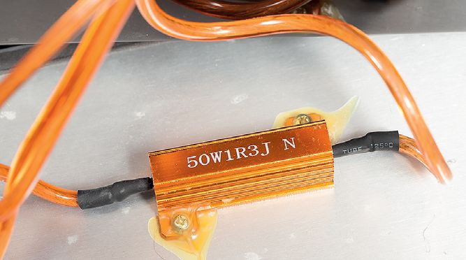 Ten rezystor, przylutowany bezpośrednio do górnego zacisku wejściowego, jest pierwszym elementem układu głośnika średniotonowego. Został przymocowany do aluminiowego panelu, który pełni też rolę radiatora.