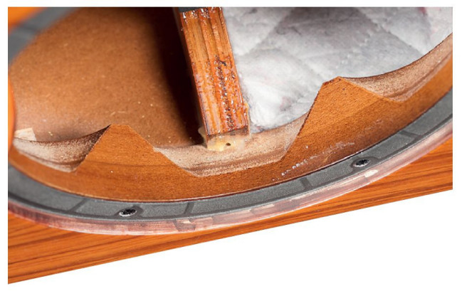 Aby ułatwić odprowadzanie fali od tylnej strony membran niskotonowych, w grubym froncie wykonano podcięcia (powiększające otwór ku tyłowi), omijające punkty mocowania (pokrywające się z żebrami kosza).