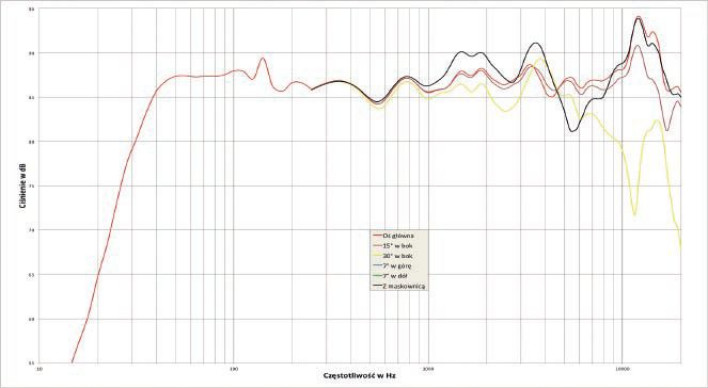 I jak już wiemy, pod kątem 15O jest wyśmienicie, dopiero pod kątem 30O widać wyraźny spadek w zakresie wysokich częstotliwości, zaczynający się od 5 kHz. Kilkudecybelowy "pik", widoczny przy 12 kHz na osi głównej i pod kątem 15O, to zaskakująco niska cena za stosowanie głośnika szerokopasmowego. Krytyce można poddać tylko wpływ maskownicy, wyraźnie psującej charakterystykę - trzeba ją po prostu zdjąć i tym sposobem zamknąć temat. Na drugim skraju pasma widzimy równe dojście do 50 Hz i spadek -6 dB (względem poziomu średniego) przy 33 Hz - to również bardzo dobry wynik, tym bardziej, że nieobarczony wcześniejszym wyeksponowaniem wyższego basu, tak więc spadek taki odliczymy także względem poziomu basu z okolic 100 Hz.
