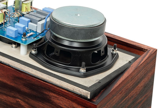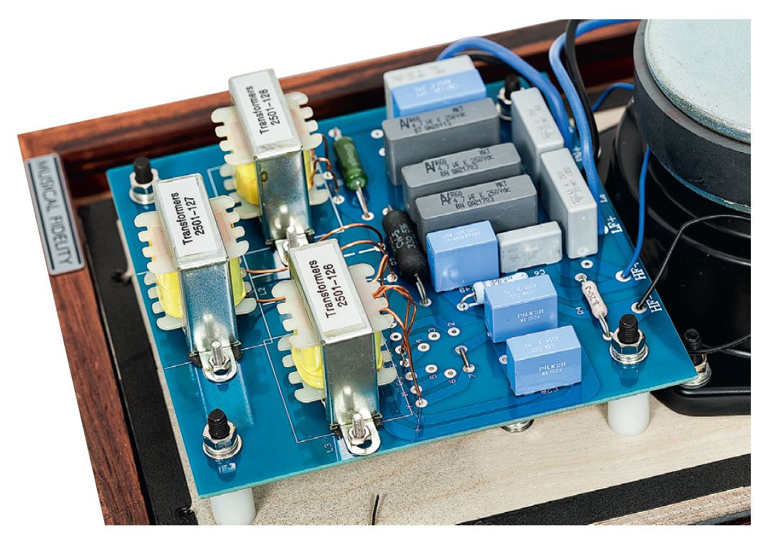 Głośnik nisko-średniotonowy został podłączony przez nietypowy filtr, złożony z dwóch cewek, trzech pojemności (złożonych z par kondensatorów) i dwóch rezystorów, a jego deklarowanym zadaniem jest nie tylko odfiltrować wysokie częstotliwości, ale też wyrównać charakterystykę w użytecznym pasmie.