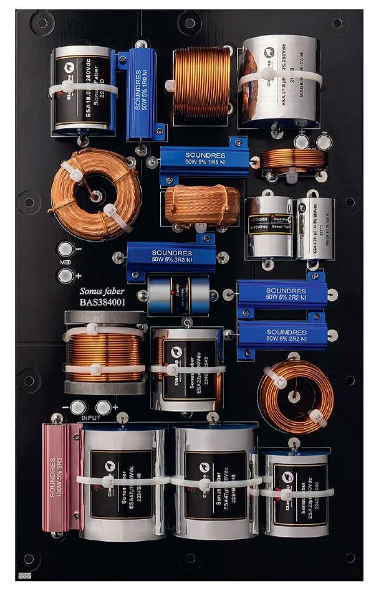 Sonus publikuje zdjęcie jednej z dwóch płytek zwrotnicy, z filtrami sekcji średnio- i wysokotonowej. Układ jest dość skomplikowany, na pewno nieminimalistyczny, w sumie jest tutaj pięć cewek (większość powietrznych), dziewięć kondensatorów (dwa równolegle, wszystkie bardzo dobre Clarity Cap serii ESA), do tego sześć rezystorów Soundres w obudowach z radiatorami (większość o mocy 50 W).